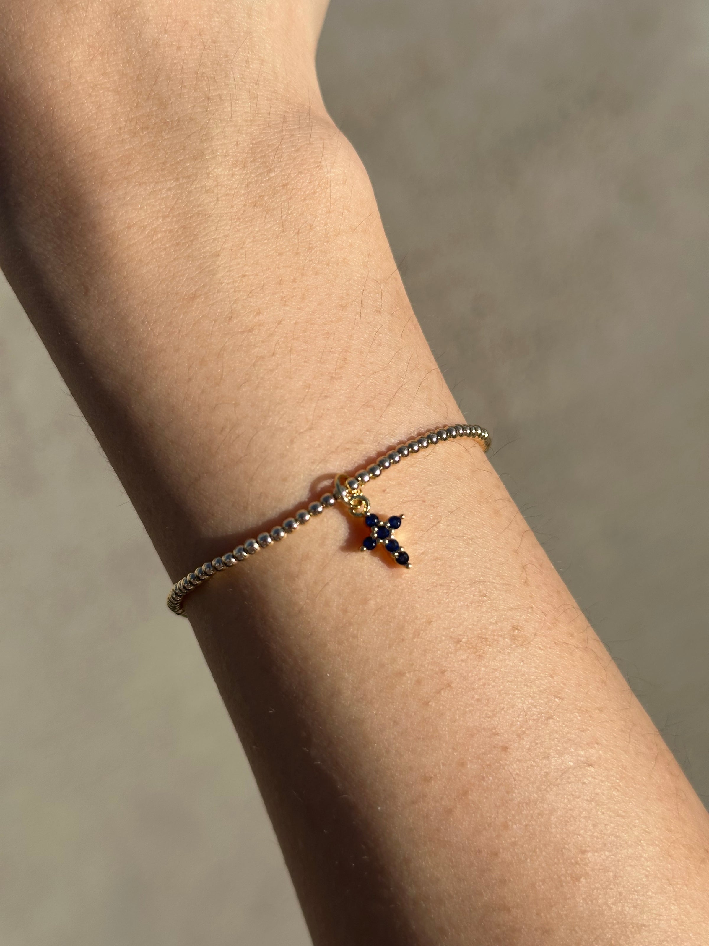 2MM beads with floating Cross CZ Charm available in gold & sterling silver.